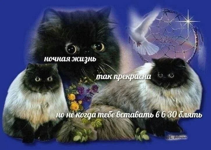 На картинке изображены три пушистые кошки: одна большая черная кошка на заднем плане с широко раскрытыми глазами, и две персидские кошки с черно-белой шерстью на переднем плане. На фоне голубого неба виден ловец снов и белый голубь. Сверху на картинке написано: «Ночная жизнь так прекрасна, но не когда тебе вставать в 6 30 блять», что переводится как «Ночная жизнь так прекрасна, но не тогда, когда тебе вставать в 6:30, блять». Это мем о том, как хорошо бодрствовать ночью, но как тяжело, если знаешь, что рано утром нужно вставать.