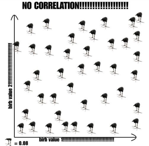 На изображении представлен точечный график без какой-либо корреляции между двумя переменными, которые обозначены как «birb value 1» (значение птицы 1) и «birb value 2» (значение птицы 2). Вместо обычных точек данных на графике рассыпаны маленькие черные птички с тонкими ножками, расположенные хаотично по всей плоскости. Над графиком крупным шрифтом написано «NO CORRELATION!!!!!!!!!!!!!!!!!» (НЕТ КОРРЕЛЯЦИИ!!!!!!!!!!!!!!!!!), что подчеркивает отсутствие какой-либо зависимости между показателями. В левом нижнем углу графика указано значение «= 0.08», вероятно, обозначающее коэффициент корреляции, который близок к нулю. Это визуально демонстрирует идею отсутствия связи между данными в шутливой форме с использованием птичек вместо точек.