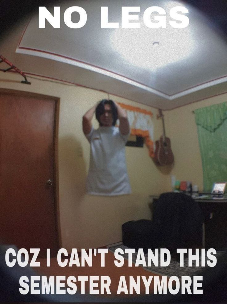 На изображении показан парень с растрепанными волосами, стоящий посреди комнаты. Он одет в белую футболку, а его ноги "отсутствуют" ниже талии, создавая иллюзию, будто он парит в воздухе. Руки парня подняты и обхватывают голову, выражая отчаяние или стресс. Над ним и под ним крупным белым шрифтом расположен текст. Надпись на английском гласит "NO LEGS COZ I CAN'T STAND THIS SEMESTER ANYMORE", что переводится как "Нет ног, потому что я больше не могу выдержать этот семестр". На фоне видны обычная комната с коричневой дверью, занавески на окне, гитара на стене и рабочий стол с креслом.