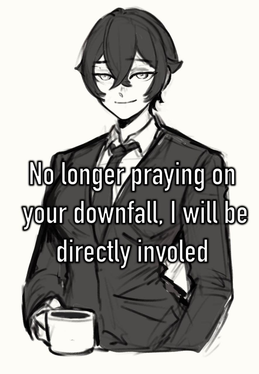 На изображении представлен нарисованный в аниме-стиле человек, предположительно мужчина, с темными волосами и хитро улыбающимся лицом. Он одет в деловой костюм с галстуком и держит в руке чашку. Его поза и выражение лица указывают на уверенность и некоторое коварство. На изображении присутствует текст на английском языке: “No longer praying on your downfall, I will be directly involed”. Эта фраза переводится как «Я больше не молюсь о твоем падении, я буду непосредственно участвовать». Это указывает на изменение пассивной позиции на активную, агрессивную роль в чужих неудачах.
