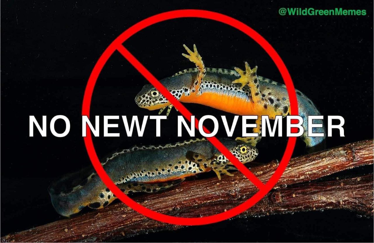 На изображении представлен мем с надписью «NO NEWT NOVEMBER» (Никаких тритонов в ноябре), которая зачеркнута красной круглой линией с перечеркнутой диагональной чертой. На фоне видны два тритона с оранжевыми животами, ползущие по ветке на черном фоне. Этот мем отсылает к популярному интернет-челленджу «No Nut November» (Никакого ореха в ноябре), но в данном случае заменяет «Nut» на «Newt» (тритон), что создает забавную игру слов и вызывает улыбку, ведь тритоны на картинке очень милые. Верхний тритон ползет вверх, а нижний — горизонтально.