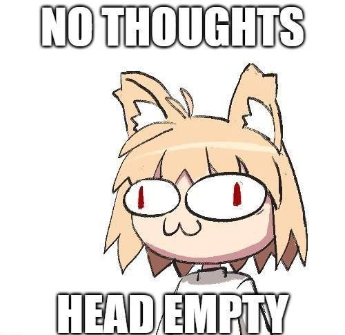 На изображении представлен мем с кошкой Нэко-Арк, персонажем из серии игр Tsukihime и Melty Blood. У нее большие, широко раскрытые глаза с красными зрачками и светло-рыжая шерсть. Нэко-Арк выглядит изумленной или шокированной, а надпись сверху гласит «NO THOUGHTS» (Нет мыслей), а снизу — «HEAD EMPTY» (Голова пуста). Этот мем часто используется для иллюстрации состояний, когда человек чувствует себя полностью опустошенным, неспособным мыслить или сосредоточиться, а также для передачи чувств усталости, перегрузки информацией или просто глупого, беззаботного состояния. Он стал популярным способом выразить отсутствие умственной активности или желание "отключить мозг" от повседневных забот и проблем.