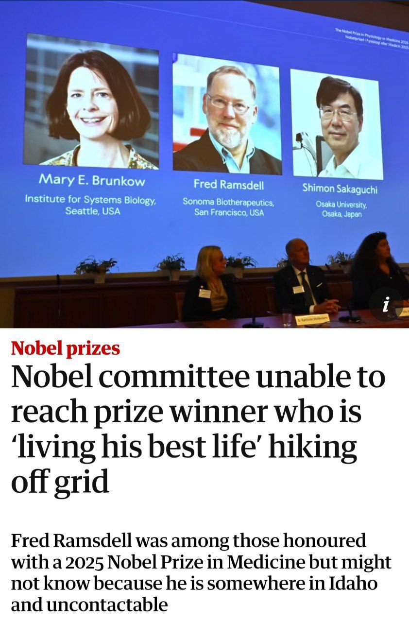 На изображении показан слайд с фотографиями трех лауреатов Нобелевской премии по физиологии или медицине 2025 года: Мэри Э. Брункоу, Фреда Рамсделла и Шимона Сакагучи. Ниже слайда, за столом, сидят несколько человек. Под слайдом находится новостная статья с заголовком «Нобелевский комитет не может связаться с лауреатом премии, который «живет своей лучшей жизнью», отправившись в поход вдали от цивилизации». В статье также уточняется, что Фред Рамсделл был среди тех, кто был удостоен Нобелевской премии по медицине 2025 года, но, возможно, он об этом не знает, потому что находится где-то в Айдахо и недоступен для связи. Мем описывает забавную ситуацию, когда важная новость о присуждении престижной премии не может быть донесена до одного из лауреатов, поскольку он предпочел быть на природе, оторвавшись от мира. Это подчеркивает иронию современной жизни, где даже такие значимые события могут пройти незамеченными для тех, кто ищет уединения и простоты.