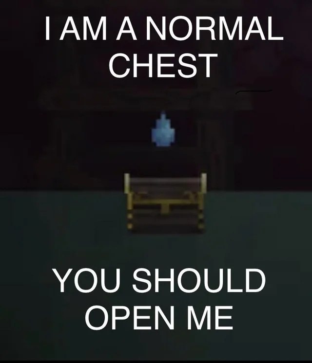 На картинке изображен скриншот из игры Noita, на котором показан сундук, призывающий себя открыть. Сундук выглядит как обычный деревянный сундук с железными полосами, но над ним парит подозрительное синее пламя, намекающее на его истинную природу. Несмотря на это, текст на изображении гласит: "I am a normal chest" (Я обычный сундук) и "You should open me" (Ты должен открыть меня), что является отсылкой к опасности, которую таят в себе сундуки-мимики в игре Noita. Эти сундуки притворяются обычными, но нападают на игрока при попытке их открыть, поэтому "ты должен открыть меня" звучит как зловещее приглашение к ловушке.