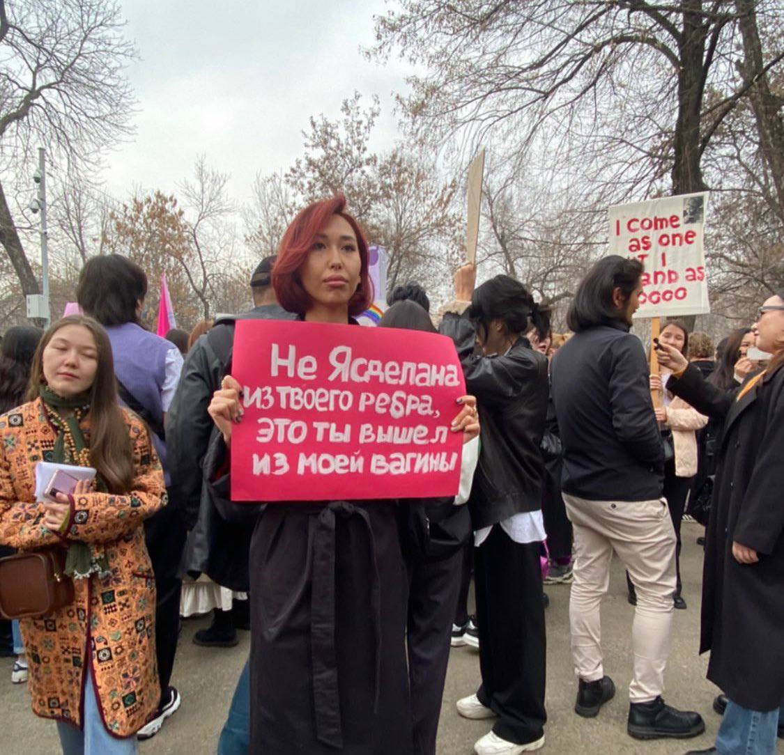 На изображении показана женщина с яркими рыжими волосами, стоящая в толпе людей. Она держит в руках ярко-розовый плакат с надписью на русском языке: «Не Ясделана из твоего ребра, это ты вышел из моей вагины». Эта фраза является отсылкой к библейскому сюжету о сотворении Евы из ребра Адама, и плакат выражает протест против патриархальных идей, подчеркивая независимость женщины. На заднем плане видны другие люди, некоторые из которых также держат плакаты. Один из плакатов на английском языке, часть которого видна: «I come as one». Общая атмосфера указывает на митинг или демонстрацию, вероятно, посвященную правам женщин или феминизму. Девушка слева от главной героини выглядит задумчивой, одета в яркий орнаментальный наряд.