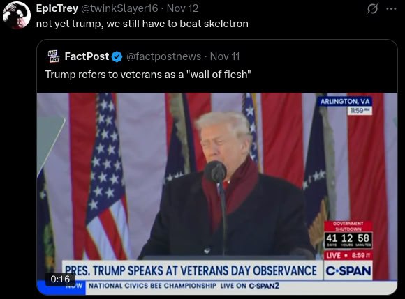 Изображение представляет собой скриншот из Твиттера, где пользователь EpicTrey прокомментировал новость от FactPost. В новости говорится, что Трамп назвал ветеранов "стеной из плоти" (wall of flesh), на что EpicTrey ответил: "not yet trump, we still have to beat skeletron" (еще нет, Трамп, нам еще предстоит победить Скелетрона). На видеозаписи видно, как Дональд Трамп выступает на фоне американских флагов, предположительно, на мероприятии, посвященном Дню ветеранов. Этот мем обыгрывает необычное сравнение ветеранов и шутливую отсылку к "Скелетрону" из популярной видеоигры.