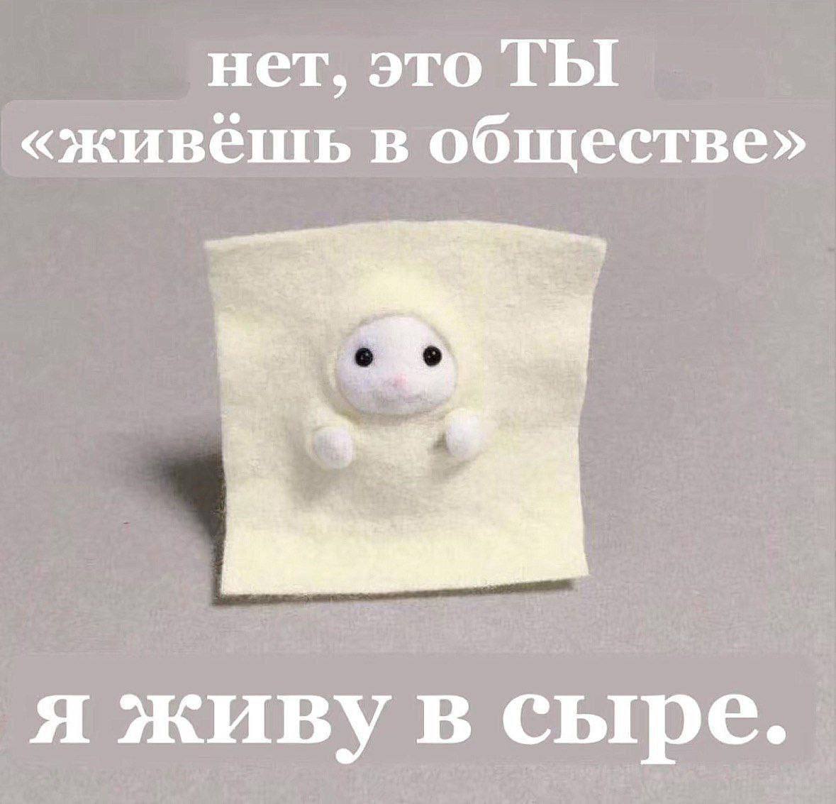 На изображении представлен милый пушистый зверёк, похожий на белого хомячка или мышку, который уютно сидит в чём-то, напоминающем кусок сыра или мягкого пледа светло-жёлтого цвета. Зверёк выглядит очень довольным, его чёрные глаза-бусинки смотрят прямо на зрителя. Фоном служит однотонная серая поверхность. Над зверьком расположен текст "Нет, это ТЫ "живёшь в обществе"", а внизу -- "я живу в сыре". Это мем, который высмеивает идею о том, что все должны "жить в обществе", противопоставляя ей желание жить в собственном комфорте и уюте, подобно этому зверьку, который предпочитает "жить в сыре".