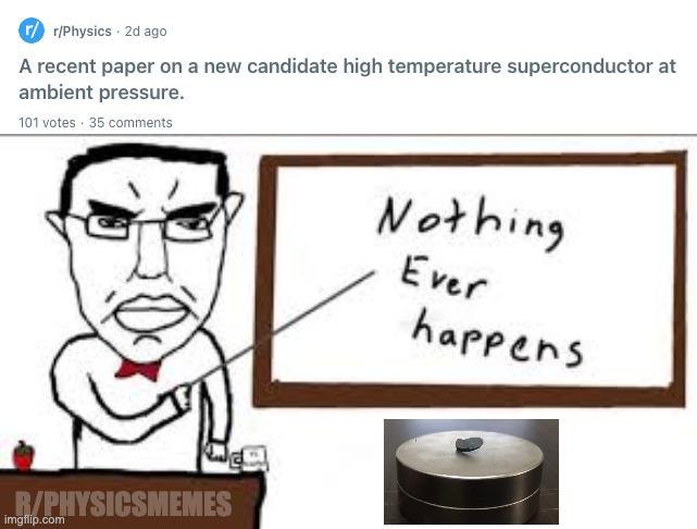 На изображении представлен мем из раздела r/PhysicsMemes, где преподаватель физики в очках и с красной бабочкой, указывая указкой на доску, где написано "Nothing Ever happens" (Ничего никогда не происходит), выражает скептицизм. При этом в верхней части мема виден заголовок поста с r/Physics о недавней публикации статьи о новом кандидате в высокотемпературные сверхпроводники при нормальном давлении. Мем иронично указывает на то, что, несмотря на захватывающие научные открытия, некоторые исследователи или общественность могут воспринимать прогресс в физике как нечто обыденное или незначительное.