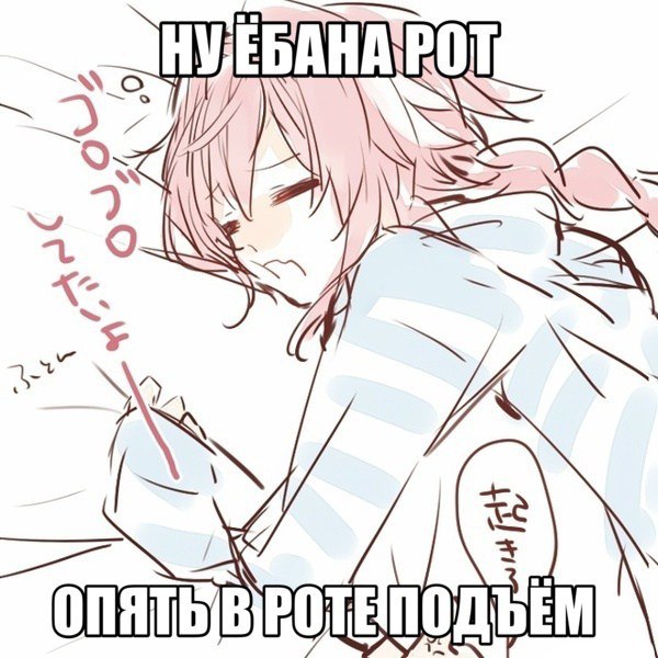 На изображении представлен аниме персонаж с розовыми волосами, который просыпается в постели, выглядя очень уставшим или недовольным. Кажется, что его что-то раздражает, и он сонно отмахивается рукой. Надпись на меме на русском языке гласит: "Ну ебана рот, опять в роте подъем", что отражает его крайне негативное отношение к пробуждению.