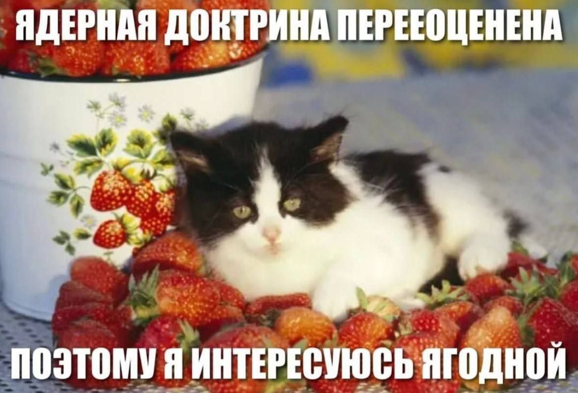 На изображении представлен милый черно-белый котенок, уютно расположившийся среди свежей красной клубники. На заднем плане виден белый эмалированный бидон с узором из клубники и цветов, также наполненный ягодами. Текст на меме гласит: «Ядерная доктрина переоценена, поэтому я интересуюсь ягодной». Это игривое сопоставление серьезной темы ядерной доктрины и невинного интереса котенка к ягодам, создающее юмористический контраст. Мем, вероятно, используется для выражения идеи о том, что в жизни есть более простые и приятные вещи, чем сложные и пугающие проблемы. Фраза «Ядерная доктрина переоценена» (meaning: "Nuclear doctrine is overrated") в сочетании с фразой «Поэтому я интересуюсь ягодной» (meaning: "Therefore I am interested in the berry one") подчеркивает отказ от беспокойства по поводу глобальных угроз в пользу наслаждения мелочами жизни, такими как вкусная клубника.