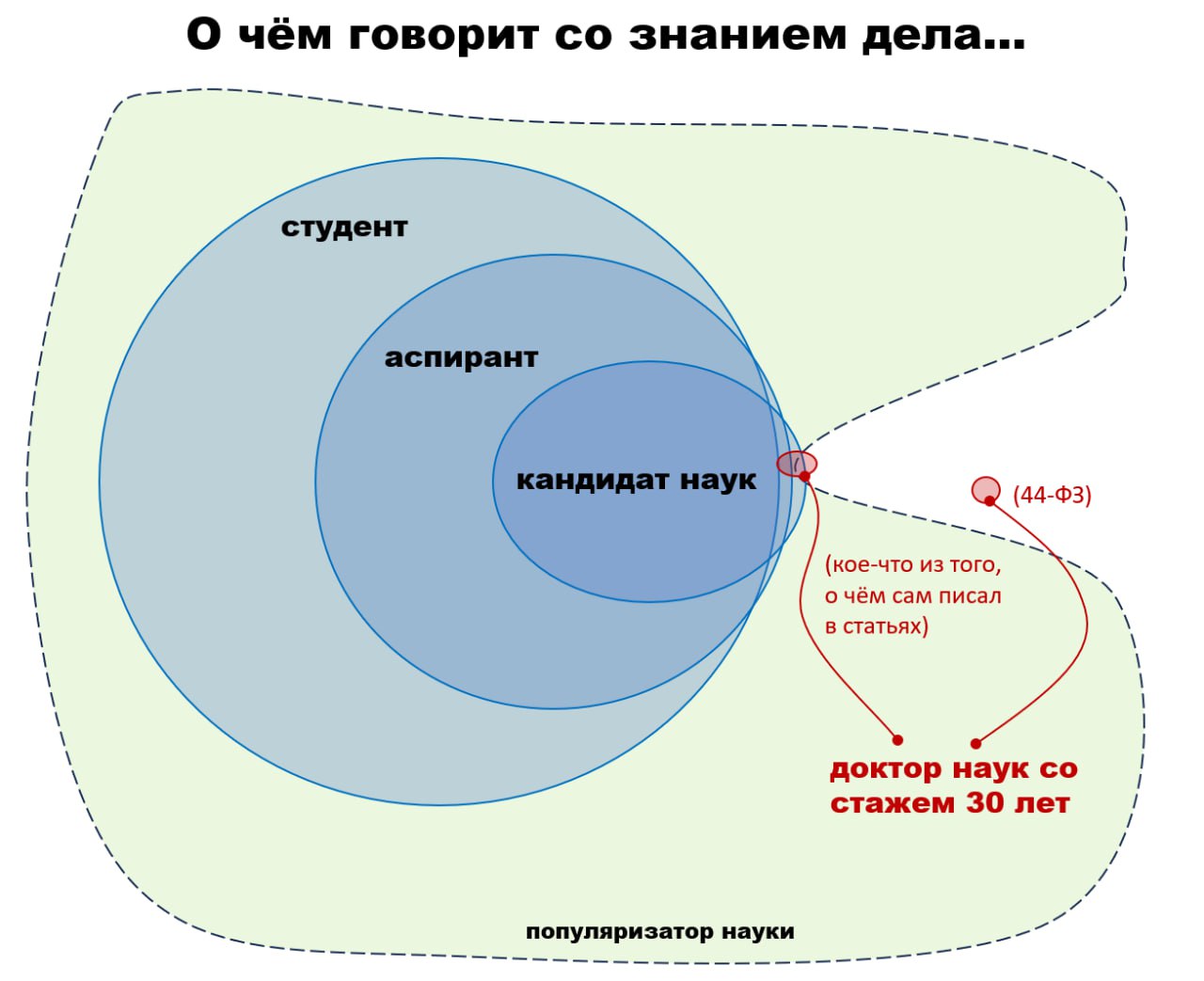 На изображении представлена диаграмма, иллюстрирующая объем знаний различных категорий людей, связанных с наукой, о которых они могут говорить со знанием дела. В центре расположены вложенные круги: самый большой круг – «студент», внутри него – «аспирант», а в самом центре – «кандидат наук». Все эти круги находятся внутри более обширной области, обозначенной как «популяризатор науки». Рядом с кругами, справа, отходит небольшая точка, обозначенная как «доктор наук со стажем 30 лет». От этой точки проведены линии, указывающие на очень малую часть из общего объема знаний: «кое-что из того, о чём сам писал в статьях» и отсылка к (44-ФЗ). Мем высмеивает тот факт, что с годами и опытом доктора наук могут специализироваться на очень узких темах, по которым они являются экспертами, в то время как популяризаторы науки охватывают гораздо более широкий круг тем.
