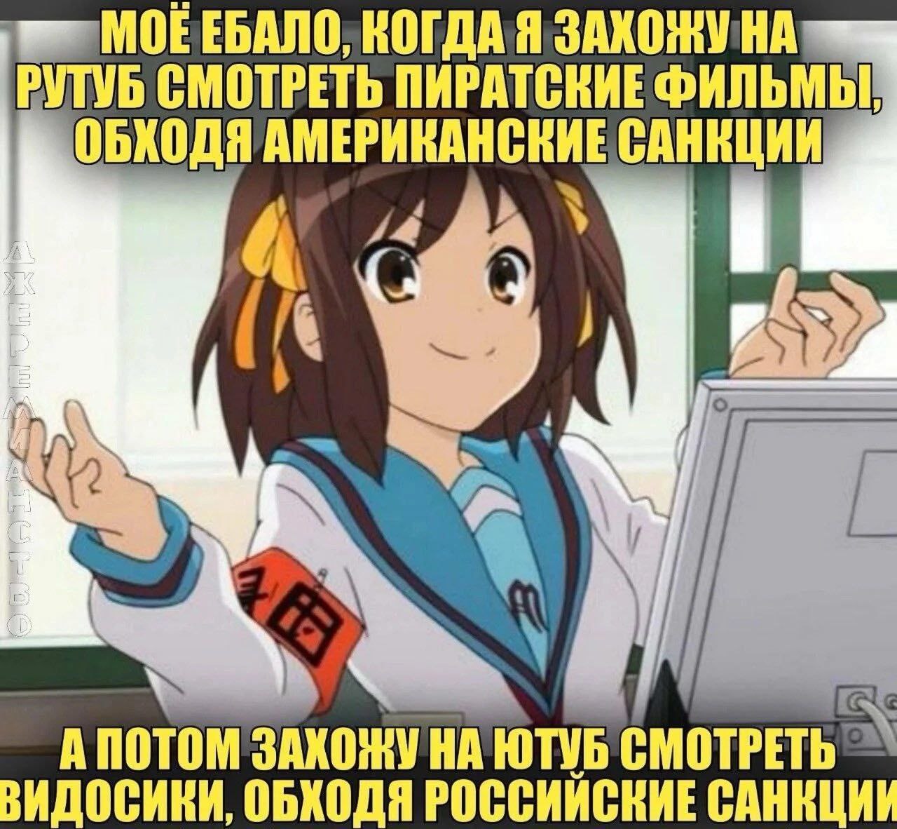 На меме изображена аниме-девушка, сидящая за компьютером. Верхняя надпись гласит: «Моё ебало, когда я захожу на рутуб смотреть пиратские фильмы, обходя американские санкции». Нижняя надпись продолжает: «А потом захожу на ютуб смотреть видосики, обходя российские санкции». Мем высмеивает ситуацию, когда пользователи интернета используют различные способы обхода блокировок и санкций, чтобы получить доступ к контенту, который иначе был бы недоступен.