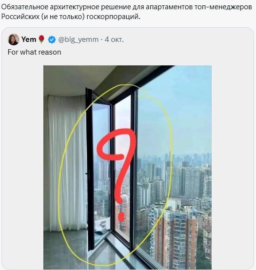 На изображении представлен скриншот из Твиттера (сейчас X), где пользователь @big_yemm опубликовал фотографию необычного окна. Это окно, расположенное, по-видимому, на высоком этаже многоквартирного дома с видом на городской пейзаж, открывается внутрь, но при этом упирается в глухую стеклянную стену, расположенную прямо перед ним. На фотографии обведена желтым кругом эта странная конструкция, а также нарисован большой красный вопросительный знак, подчеркивающий недоумение. Подпись к изображению на русском языке гласит: «Обязательное архитектурное решение для апартаментов топ-менеджеров Российских (и не только) госкорпораций», а текст на английском языке «For what reason» переводится как «по какой причине». Мем высмеивает бессмысленные и нефункциональные дизайнерские решения, которые часто встречаются в элитном жилье, намекая на то, что такие странности могут быть характерны для недвижимости высокопоставленных чиновников или топ-менеджеров, возможно, из-за их специфических требований или избыточных бюджетов.