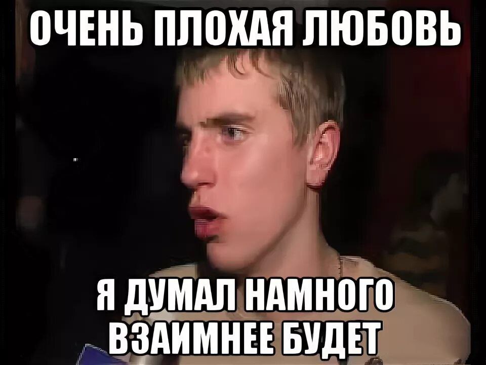 На переднем плане — молодой парень, которого снимают крупным планом. Его выражение лица выглядит немного растерянным или разочарованным. Он смотрит в сторону, его рот слегка приоткрыт. Волосы у парня светлые, на нем светлая футболка и цепочка на шее. Фон размыт и темный. Надпись сверху гласит: "ОЧЕНЬ ПЛОХАЯ ЛЮБОВЬ", что переводится как "Очень плохая любовь". Снизу добавлено: "Я ДУМАЛ НАМНОГО ВЗАИМНЕЕ БУДЕТ", что переводится как "Я думал, будет гораздо взаимнее".