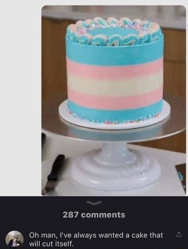 На изображении показан торт, украшенный глазурью голубого, розового и белого цветов, которые напоминают цвета флага трансгендеров. Торт стоит на подставке для торта, а рядом с ним лежит нож для торта. Под изображением торта находится комментарий пользователя, который гласит: "Oh man, I've always wanted a cake that will cut itself" (О, чувак, я всегда хотел торт, который сам себя разрежет). Этот комментарий является игрой слов, отсылающей к трансгендерным людям и самоповреждению, что делает мем довольно провокационным.