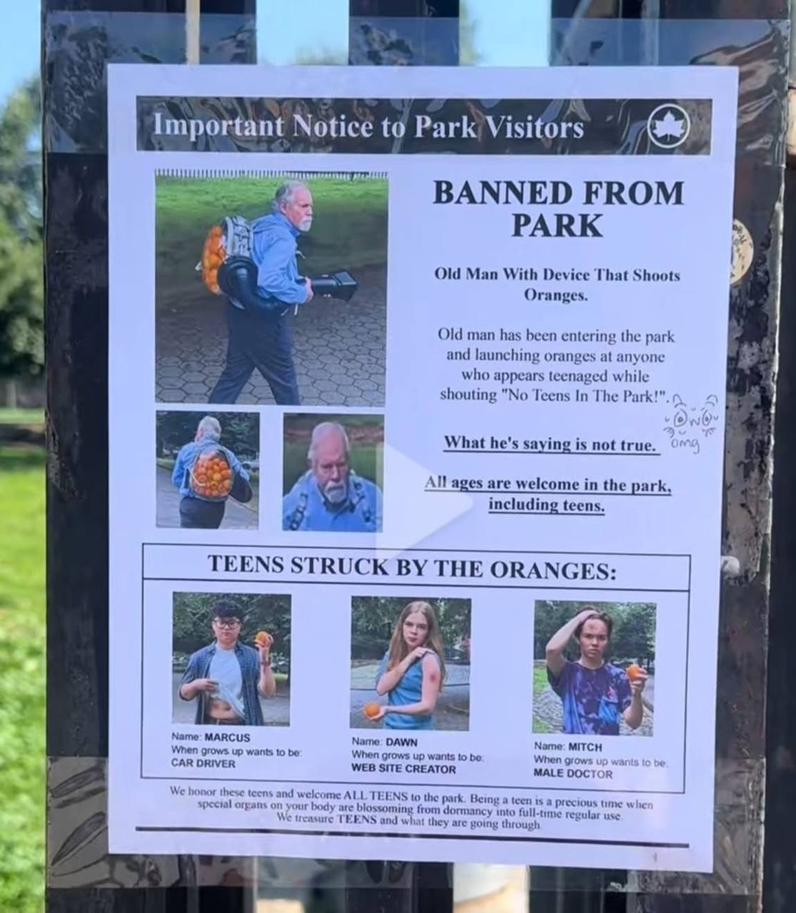 На постере, озаглавленном "Important Notice to Park Visitors" (Важное сообщение для посетителей парка), сообщается о запрете на посещение парка пожилому мужчине, который использовал устройство для метания апельсинов в подростков. На постере представлены фотографии этого мужчины, одна из которых показывает его со спины, где видно рюкзак, наполненный апельсинами, и еще одна фотография, где он изображен крупным планом. Также на постере есть изображения подростков, которые, как утверждается, пострадали от апельсинов: Маркус, который хочет стать водителем, Доун, которая хочет стать создателем веб-сайтов, и Митч, который хочет стать врачом. Подчеркивается, что все возрасты, включая подростков, приветствуются в парке. Также там есть надписи маленькими буквами в духе OMG, что придает мему юмористический оттенок. Дедушка, метающий апельсины в подростков с криками "No Teens In The Park!" (Подросткам не место в парке!), выглядит одновременно забавно и абсурдно.