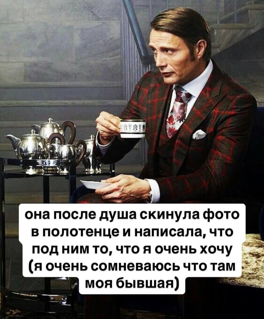 На картинке изображен актер Мадс Миккельсен в роли Ганнибала Лектера, одетого в элегантный клетчатый костюм и держащего в руке чашку чая. Он сидит за столом, на котором стоит изящный чайный сервиз. Лицо актера выражает задумчивость или легкое недоумение. Внизу картинки находится большой белый текстовый блок с подписью: «Она после душа скинула фото в полотенце и написала, что под ним то, что я очень хочу (я очень сомневаюсь что там моя бывшая)». Это переводится как: «Она после душа скинула фото в полотенце и написала, что под ним то, что я очень хочу (я очень сомневаюсь, что там моя бывшая)». Мем описывает ситуацию, когда ожидание чего-то приятного сталкивается с забавным ироничным комментарием, намекающим на разочарование или неожиданный исход. Выражение лица Ганнибала идеально передает эту смесь серьезности и легкого скепсиса.