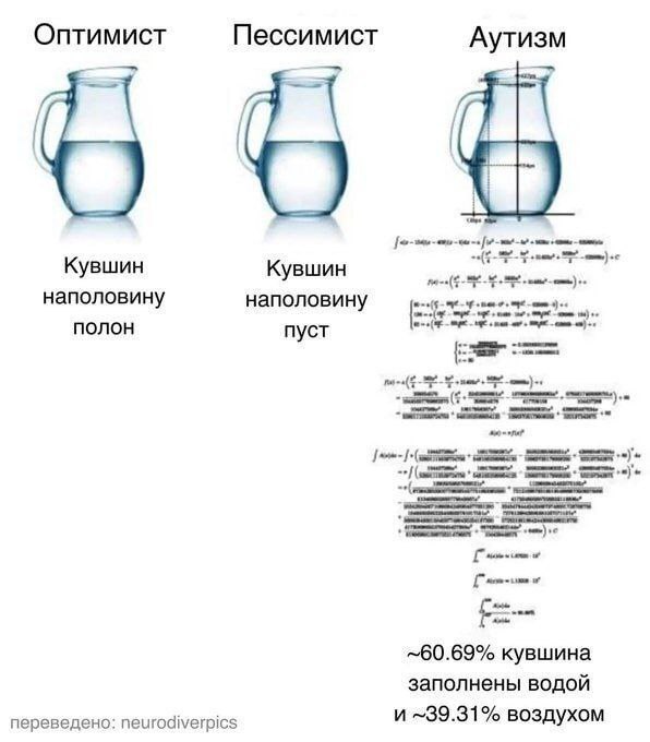 Оптимист. Пессимист. Аутизм. Кувшин наполовину полон. Кувшин наполовину пуст. ~60.69% кувшина заполнены водой и ~39.31% воздухом. Переведено: neurodiverpics.