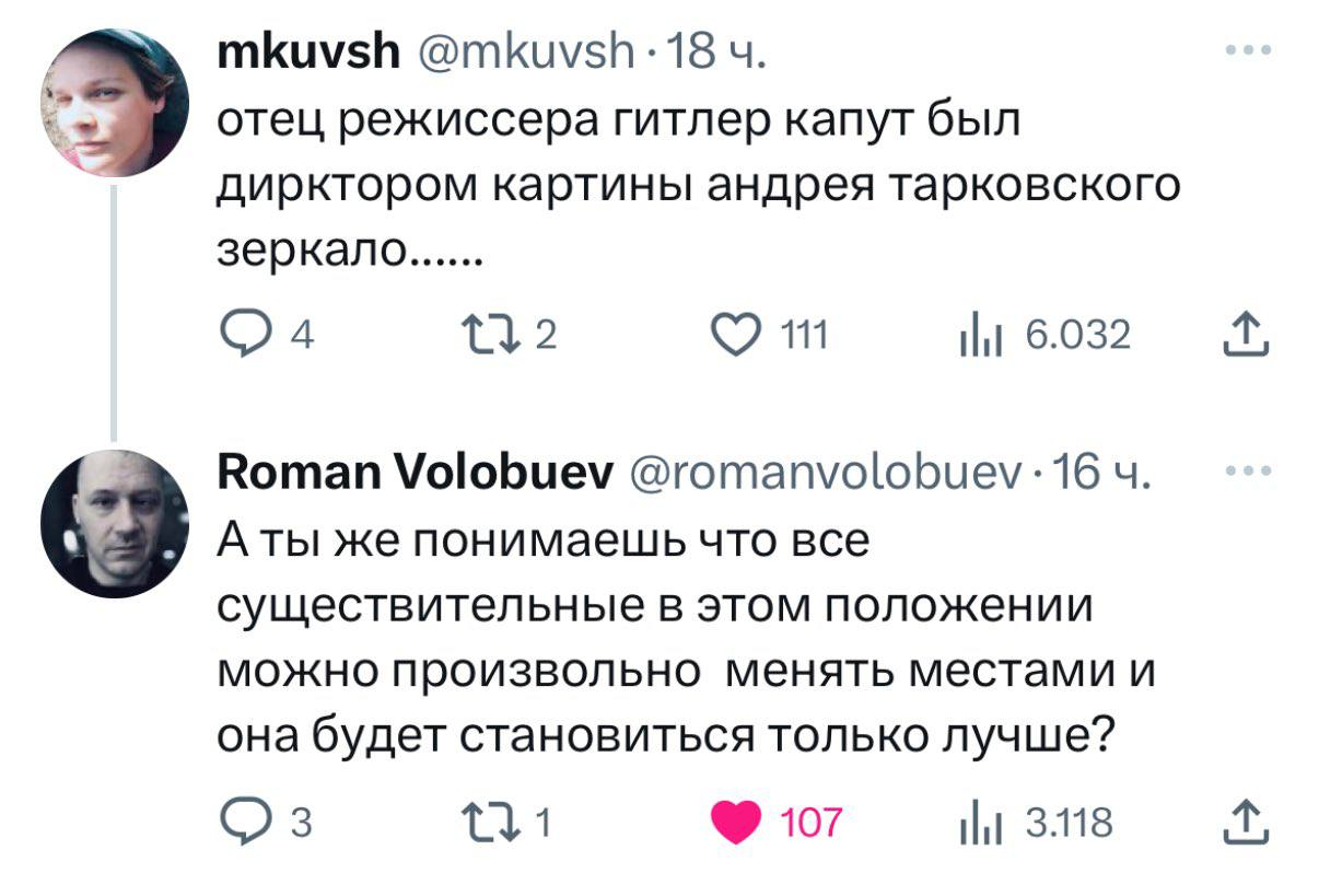 На изображении представлен скриншот переписки из социальной сети. Первый пост от пользователя mkuvsh гласит: "Отец режиссера Гитлер капут был директором картины Андрея Тарковского Зеркало...". Этот текст выглядит очень странно и грамматически запутанно, из-за чего его трудно понять. Ниже следует ответ от пользователя Roman Volobuev: "А ты же понимаешь что все существительные в этом положении можно произвольно менять местами и она будет становиться только лучше?". Роман Волобуев подмечает, что из-за абсурдности фразы, любое изменение порядка слов сделает ее только лучше или смешнее. Мем обыгрывает бессмысленность и нелепость исходного высказывания.