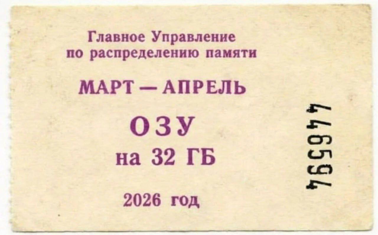На изображении представлен мем, стилизованный под советский талон на дефицитный товар. Талон выдан "Главным Управлением по распределению памяти" на март-апрель 2026 года и предоставляет "ОЗУ на 32 ГБ". Справа вертикально напечатан номер талона "446594". Это юмористическое изображение, высмеивающее нехватку компьютерной памяти, отсылает к дефициту товаров в прошлом, предполагая, что в будущем даже оперативная память может стать предметом нормированного распределения. Талон имеет слегка пожелтевший вид и следы износа, что добавляет ему аутентичности и усиливает эффект ретро.