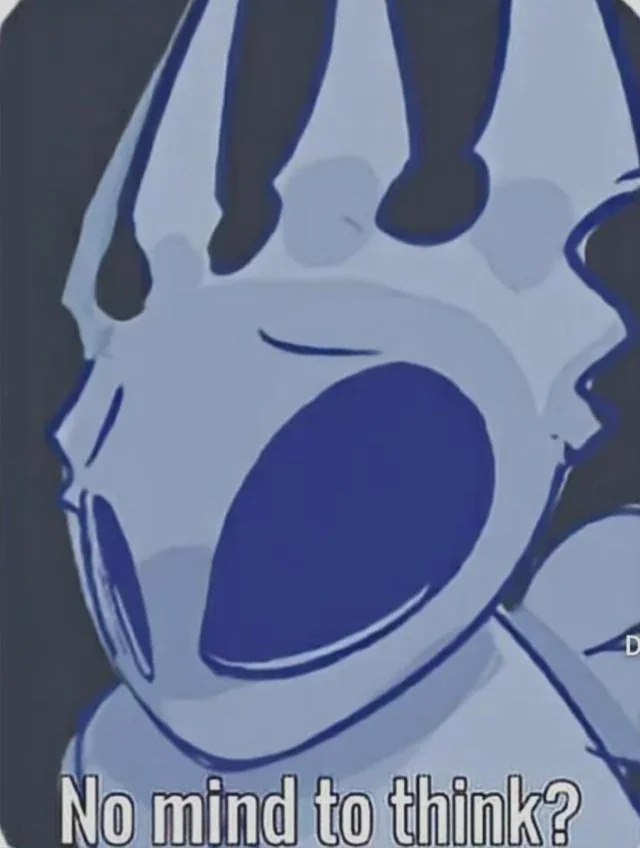 На изображении представлен стилизованный персонаж из игры Hollow Knight, известный как "Бледный Король" (Pale King). Он изображен в профиль, с закрытыми глазами, словно глубоко задумавшись или погруженный в медитацию. В нижней части изображения крупным планом расположен текст "No mind to think?", что в переводе на русский означает "Нет разума, чтобы думать?". Этот мем часто используется для выражения состояния полного отсутствия мыслей или неспособности соображать в какой-либо ситуации, а также как реакция на что-то, что не требует логического осмысления.