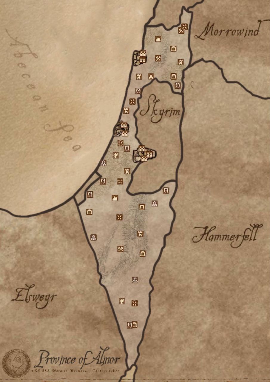 На изображении представлена карта, которая на первый взгляд кажется картой игрового мира, но при ближайшем рассмотрении оказывается стилизованным изображением политической карты Израиля и Палестины. На этой карте, выполненной в стиле игры The Elder Scrolls V: Skyrim, различные регионы обозначены названиями провинций из вселенной TES, таких как "Morrowind", "Skyrim", "Hammerfell" и "Elsweyr". Морские просторы подписаны как "Abecean Sea". Территория, которая очертаниями напоминает Израиль и Палестину, разбита на множество мелких областей, в каждой из которых расположены значки из игры Skyrim: города, шахты, лагеря и другие локации. Внизу карты также присутствует надпись "Province of Alinor", выполненная шрифтом, характерным для игр Bethesda, с указанием "3E 433 Natalie Dreamarel, Cartographer". Это создает забавный контраст между реальной геополитической картой и фэнтезийной стилизацией, предлагая свежий взгляд на знакомую территорию через призму популярной ролевой игры.