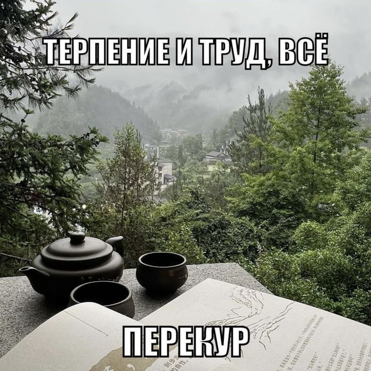 На переднем плане изображения расположена терраса, на которой стоят чайник, две чашки и открытая книга. За террасой видны густые зеленые деревья, а на заднем плане простирается горный пейзаж с туманом или облаками, покрывающими вершины. Вдали видны небольшие здания, вероятно, это горное поселение или деревня. Вверху расположена надпись "Терпение и труд, всё", а внизу -- "Перекур", что намекает на небольшой отдых после долгого процесса. Это может быть отражением того, что даже самые упорные дела требуют перерывов для восстановления сил.
