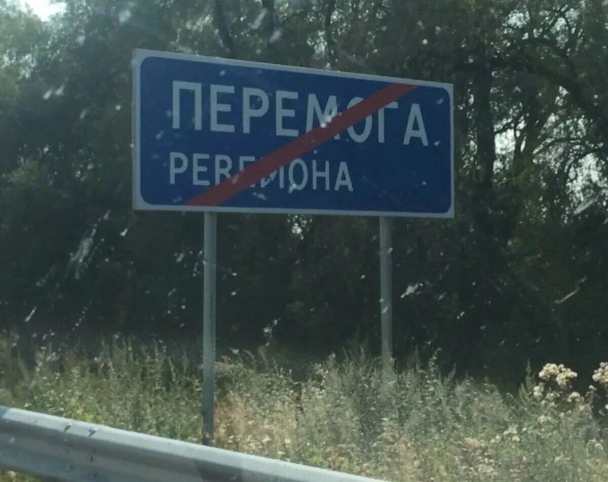 На изображении показан дорожный знак синего цвета с белыми надписями. На знаке крупными буквами написано «ПЕРЕМОГА», а под ней — «РЕRЕМОНА». Слово «ПЕРЕМОГА» перечеркнуто красной линией, что символизирует ее окончание. Знак установлен на фоне зеленой растительности и деревьев, создавая впечатление, что он находится на обочине дороги. Сам знак немного грязный и местами поврежден, что добавляет ему реалистичности. Это изображение символизирует конец «перемоги», что в переводе с украинского означает «победа» или «триумф».