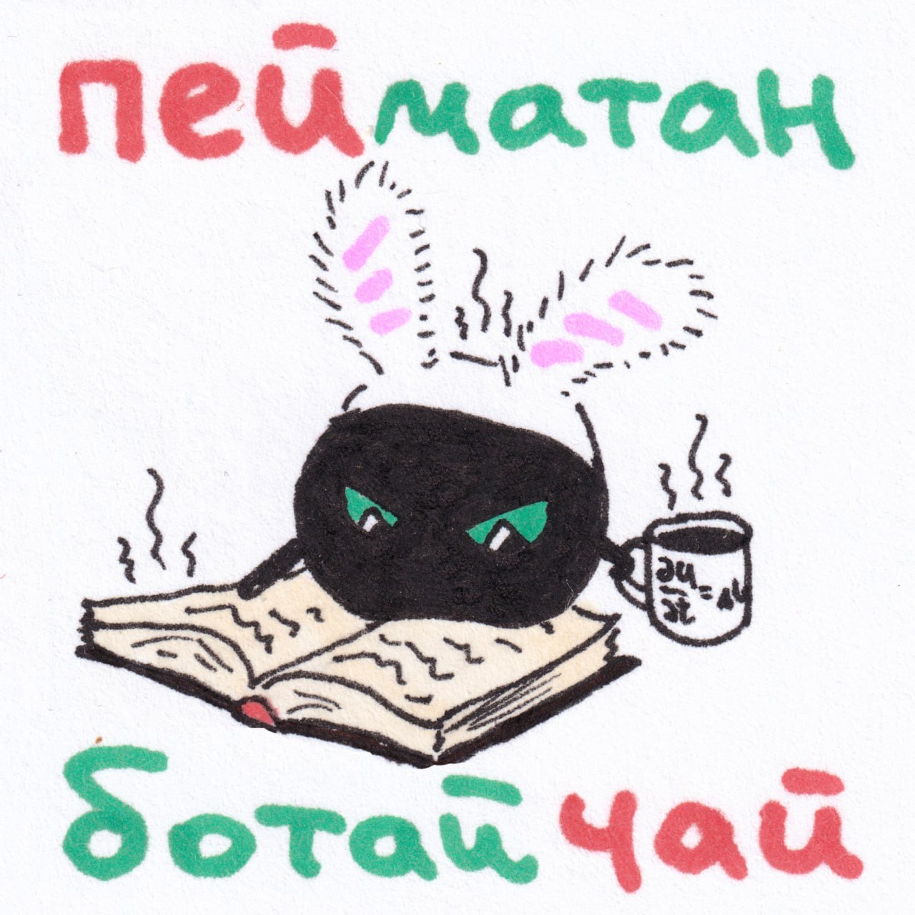 На изображении представлен черный пушистый комочек с зелеными глазами и заячьими ушками, который сидит на раскрытой книге. От книги и от самого комочка исходит пар, что создает впечатление усталости или напряженной умственной работы. В одной из рук комочек держит кружку с горячим напитком, на которой написана математическая формула. Над ним красным и зеленым шрифтом написано "Пей матан", что переводится как "Пей математику" или "Занимайся математикой". Под ним же написано "Ботай чай", что означает "Ботай чай" или "Учи чай", в данном контексте "ботать" означает усиленно заниматься чем-либо. Все это создает образ студента или ученого, который усердно учится, возможно, по математике, и пьет чай для поддержания бодрости.
