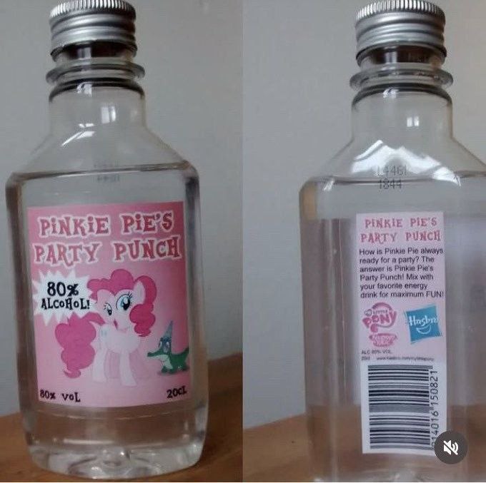 На изображении показаны две стороны маленькой прозрачной бутылки с серебристой крышкой. На розовой этикетке спереди написано «Pinkie Pie's Party Punch» и крупными буквами «80% ALCOHOL!». Также на этикетке изображена розовая пони по имени Пинки Пай из мультфильма «My Little Pony» и небольшой зеленый крокодил. На обратной стороне этикетки также написано «Pinkie Pie's Party Punch» и мелким шрифтом на английском языке вопрос: «Как Пинки Пай всегда готова к вечеринке?» и ответ: «Pinkie Pie's Party Punch! Смешайте с вашим любимым энергетическим напитком для максимального веселья!» Также на этикетке есть логотипы My Little Pony и Hasbro, информация о 80% алкоголя и штрихкод.