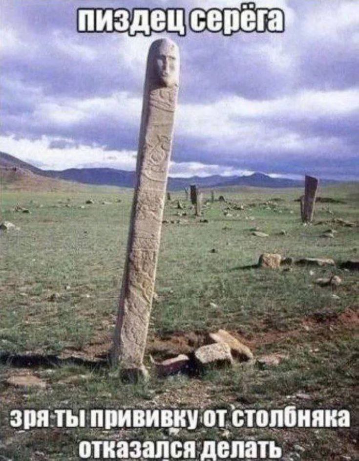 На изображении показан каменный столб, высеченный в виде стилизованного человеческого лица, стоящий посреди поля с редкой травой и другими подобными, но менее выраженными каменными изваяниями на заднем плане. На горизонте виднеются горы, а небо затянуто облаками. Надпись на меме "Пиздец, Серёга, зря ты прививку от столбняка отказался делать" является ироничным комментарием, намекающим на характерные позы или окоченение, вызванные столбняком, сравнивая их с неподвижностью каменного изваяния. Этот юмор построен на визуальном сходстве и чёрном юморе, где столбняк представлен в шутливой форме как причина превращения в камень.