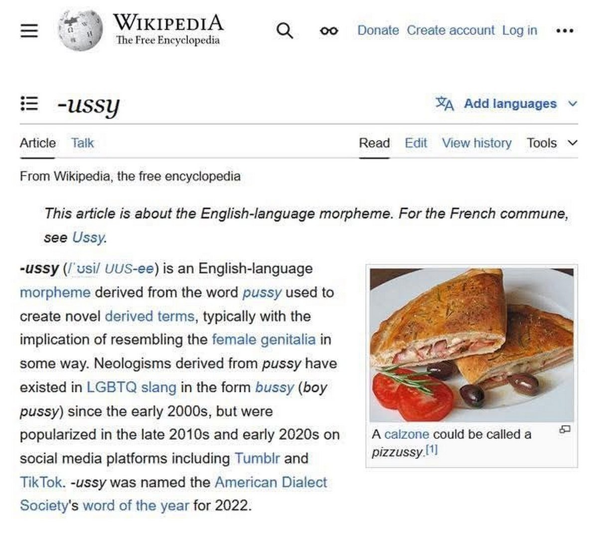На изображении представлен скриншот страницы Википедии, посвященной английской языковой морфеме "-ussy". Эта морфема, согласно описанию, происходит от слова "pussy" и используется для создания новых терминов, обычно подразумевающих некоторое сходство с женскими гениталиями. В статье также упоминаются неологизмы, появившиеся в сленге ЛГБТК-сообщества, такие как "bussy" (boy pussy), и говорится о популяризации этой морфемы в социальных сетях, включая Tumblr и TikTok. В 2022 году "-ussy" было названо словом года по версии Американского диалектического общества. Рядом с этим текстом находится изображение двух кальцоне, одной из которых приписан комментарий: "A calzone could be called a pizzussy". Таким образом, мем высмеивает или показывает абсурдность использования этой морфемы для описания обычного блюда, создавая комический эффект за счет неожиданного и двусмысленного сочетания.