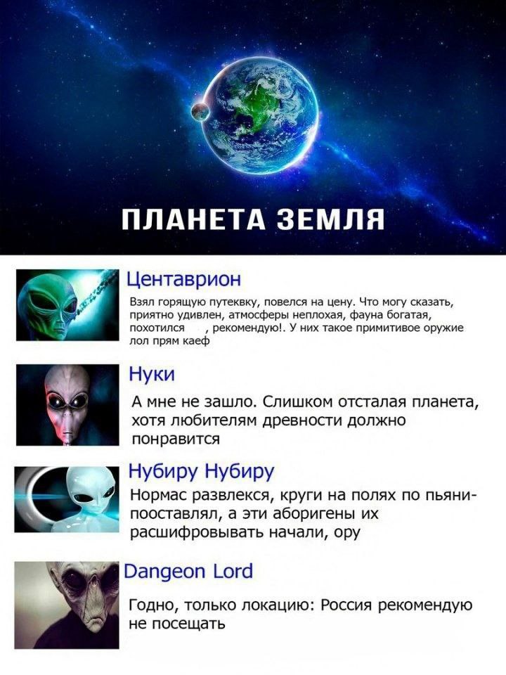 Мем представляет собой изображение планеты Земля на фоне звездного неба, с подписью "Планета Земля" внизу. Ниже располагаются комментарии от разных инопланетян, которые якобы посетили или оценивают Землю, как будто это туристическая путевка или отзыв о локации. Каждый комментарий имеет свой "никнейм" и аватарку в виде пришельца. Отзывы варьируются от восторженных ("взял горящую путевку, повелся на цену... лол прям кайф"), до критических ("слишком отсталая планета"), и даже юмористических, как, например, комментарий про круги на полях и аборигенов, которые пытаются их расшифровать. Последний комментарий особенно забавен, так как "Dangeon Lord" пишет: "Годно, только локацию: Россия рекомендую не посещать". Этот мем пародирует систему отзывов и оценок, применяя ее к целой планете, что создает комический эффект. Инопланетные "туристы" делятся своими впечатлениями о земной фауне, атмосфере, примитивном оружии и даже дают специфические рекомендации по посещению определенных регионов.