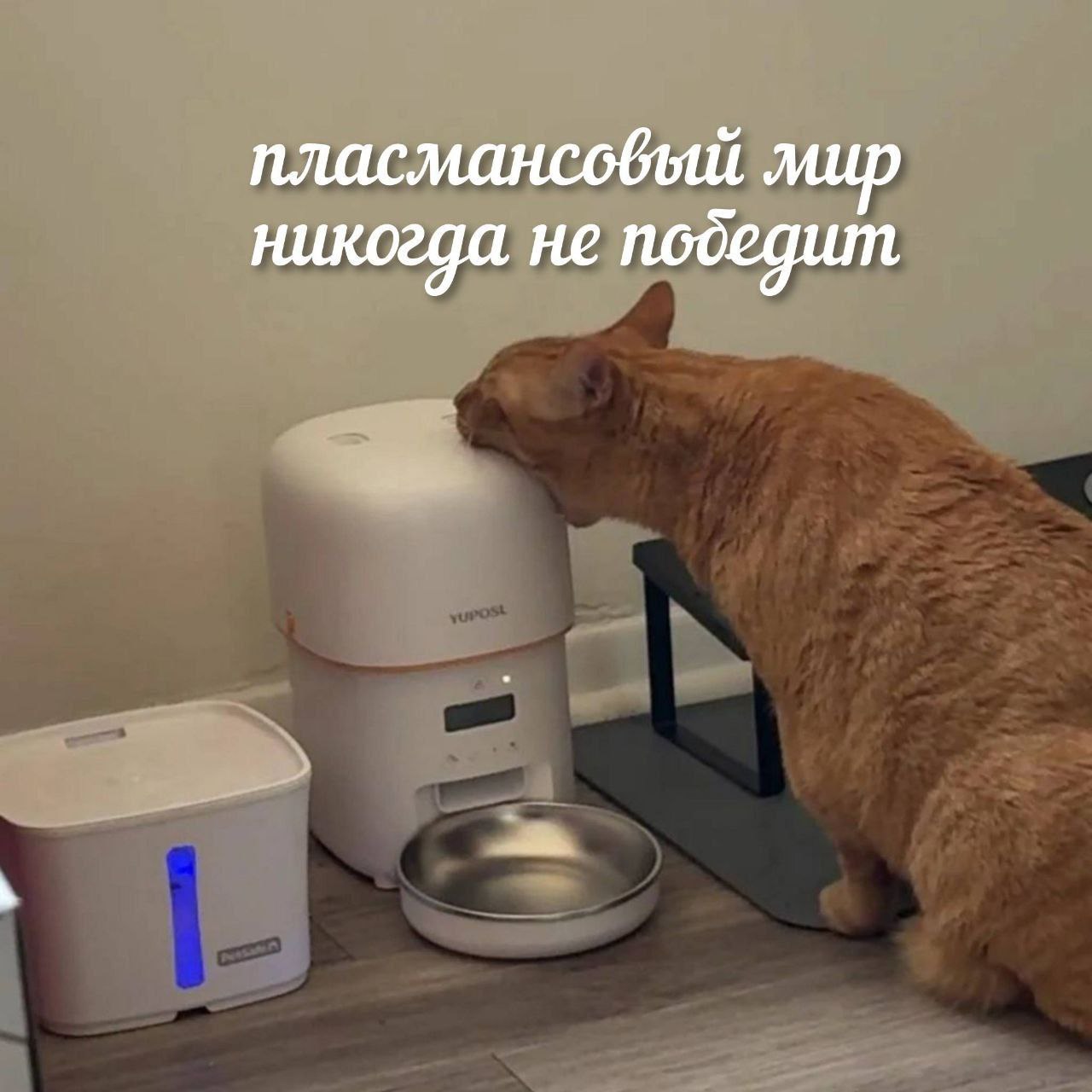 На картинке изображен рыжий кот, который прильнул головой к автоматической кормушке для животных. Рядом с кормушкой стоит пустая металлическая миска, и видно, что кот пытается достать корм из верхней части устройства, несмотря на то, что это бесполезно. На заднем плане также видна автоматическая поилка. Над котом белым шрифтом написано: «Пластмассовый мир никогда не победит». Эта фраза, «Пластмассовый мир никогда не победит», является отсылкой к песне группы «Гражданская оборона» и может интерпретироваться как борьба живой природы с искусственными изобретениями или технологиями.