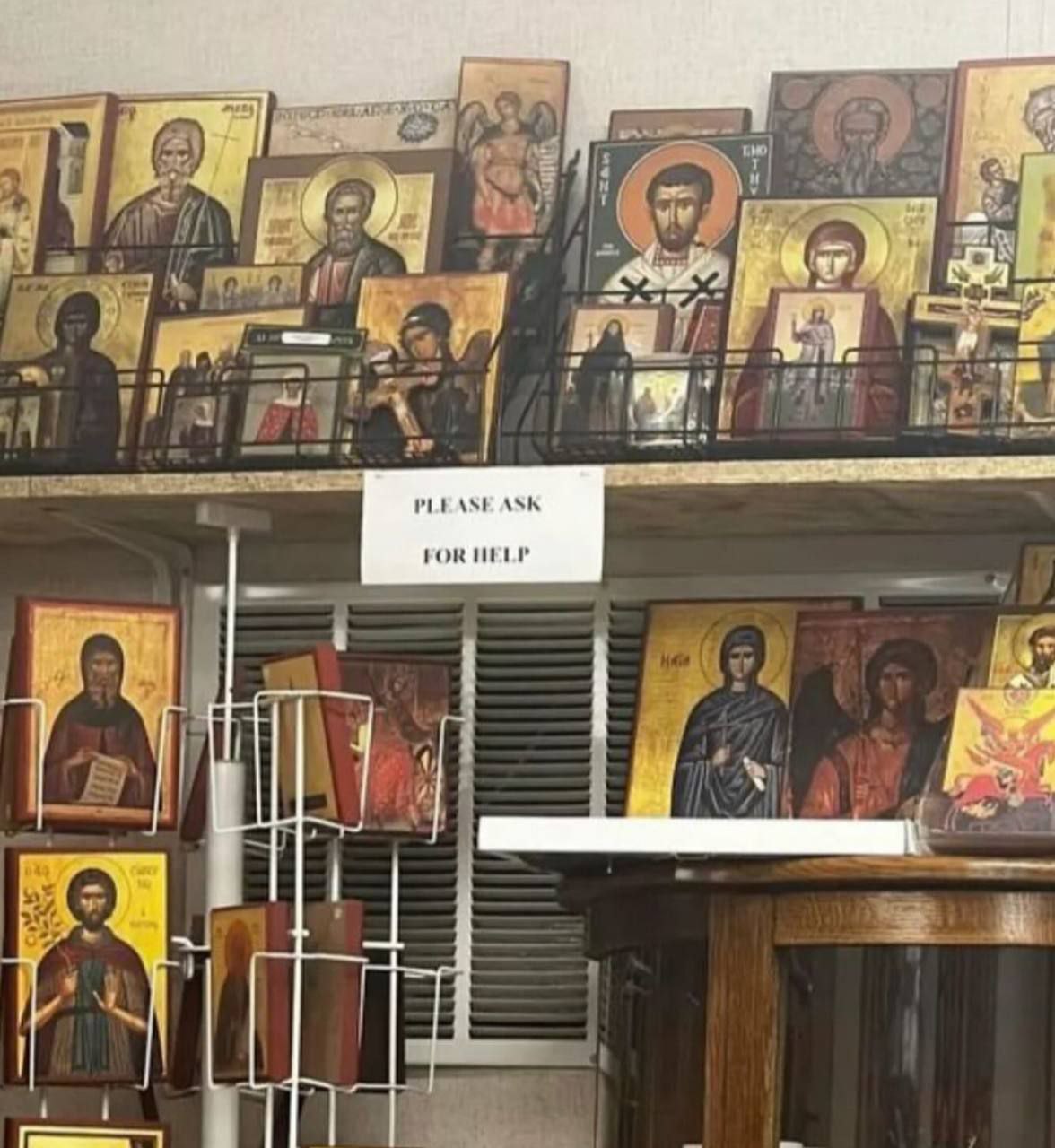 На изображении виден стеллаж с множеством икон разных размеров и стилей, расположенных на нескольких полках. Иконы изображают различных святых, ангелов и библейские сюжеты. В центре, между полками, висит небольшая белая табличка с надписью на английском языке «Please ask for help». Ряд икон выложен на верхней полке, а также видны подставки для икон, некоторые из которых уже заняты, другие пустые. Изображение демонстрирует разнообразный ассортимент религиозных предметов, возможно, в церковной лавке или магазине сувениров. Надпись «Please ask for help» (Пожалуйста, обратитесь за помощью) создает контраст с изображением святых ликов.