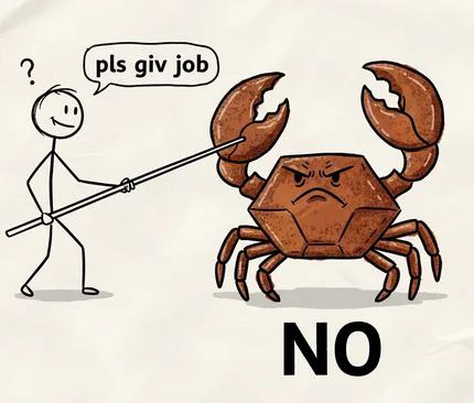 На изображении нарисован человечек из "палок" с вопросительным знаком над головой, который тычет палкой в большого коричневого злого краба, а в текстовом облаке над человечком написано «pls giv job» (пожалуйста, дайте работу). Внизу, под крабом, огромными буквами написано «NO» (НЕТ). Мем отражает типичную ситуацию в поиске работы, когда соискатель (человечек) отчаянно ищет вакансии, а работодатель (краб) или рынок труда в целом жестко отказывает, показывая свое нежелание предоставлять работу. Это может символизировать трудности с трудоустройством, отказ после собеседований или общее отсутствие возможностей. Смысл в том, что даже самые настойчивые попытки получить работу могут столкнуться с непреодолимыми препятствиями, вызывая чувство фрустрации и безысходности.