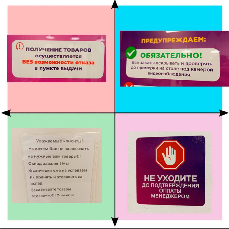 Изображение представляет собой политический компас мемов, где в каждом квадранте расположен текст с объявлениями из пункта выдачи заказов, предположительно Wildberries. Верхний левый квадрант (авторитаризм и левые взгляды) содержит объявление о получении товаров без возможности отказа. Верхний правый (авторитаризм и правые взгляды) – предупреждение о необходимости вскрывать и проверять все заказы под камерой видеонаблюдения до примерки. Нижний левый (либерализм и левые взгляды) показывает объявление с просьбой не заказывать ненужные товары, так как склад переполнен. Наконец, в нижнем правом квадранте (либерализм и правые взгляды) расположено объявление, запрещающее уходить до подтверждения оплаты менеджером. Эти объявления демонстрируют различные аспекты взаимодействия покупателей и продавцов, а также ограничения и требования, с которыми сталкиваются клиенты в пунктах выдачи.