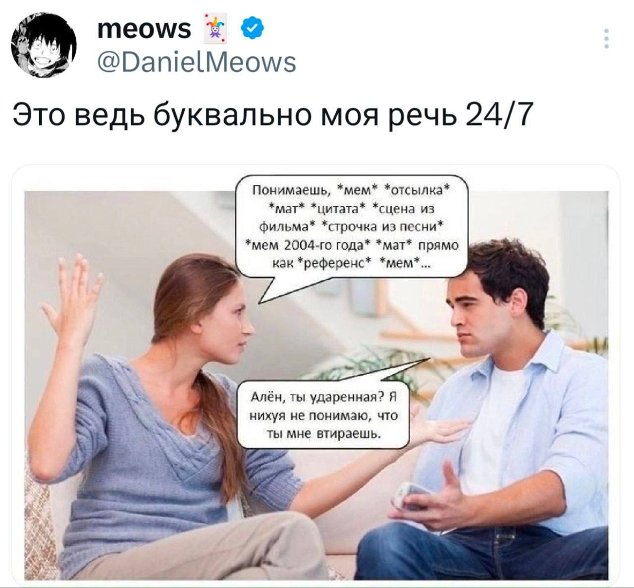 meows. @DanielMeows. Это ведь буквально моя речь 24/7. Понимаешь, *мем* *отсылка* *мат* *цитата* *сцена из фильма* *строчка из песни* *мем 2004-го года* *мат* прямо как *референс* *мем*… Алён, ты ударенная? Я нихуя не понимаю, что ты мне втираешь.