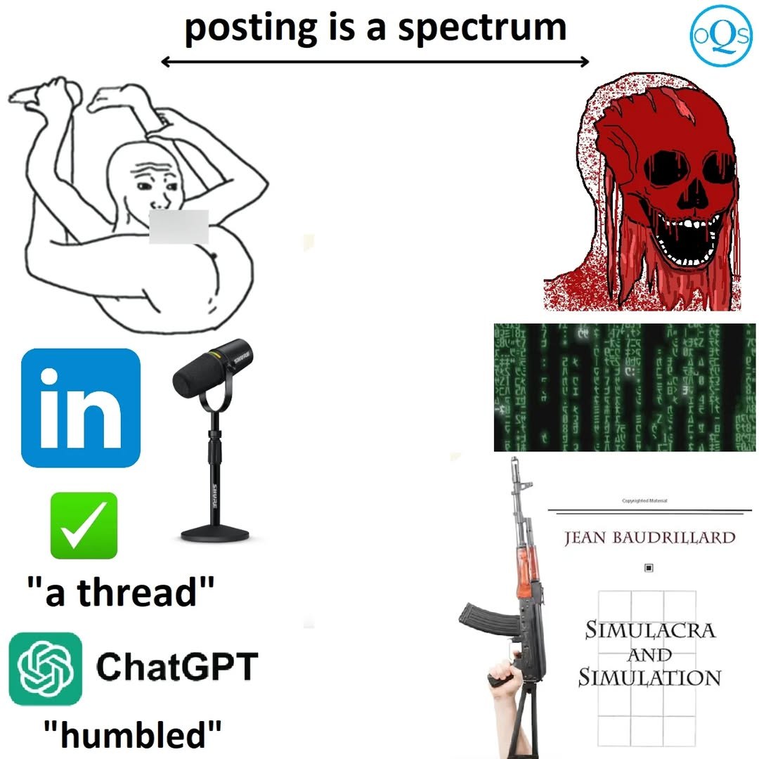 Мем "posting is a spectrum" представляет собой горизонтальный спектр, который иллюстрирует различные стили и подходы к публикации контента в интернете. В левой части спектра показан "нормальный" или более социально приемлемый вид постинга: изображение человека-войака, выполняющего "гибкий" жест, рядом с логотипами LinkedIn, зеленой галочкой, надписями "a thread", "ChatGPT" и "humbled". Это символизирует посты, которые соответствуют стандартам профессиональных сетей, длинные треды с обоснованными аргументами, использование ИИ для создания контента или выражения скромности. В правой части спектра изображен более экстремальный и, возможно, "темный" вид постинга. Здесь представлен "кровавый" wojak, который выглядит искаженным и пугающим, с открытым ртом. Рядом с ним находится изображение кода из "Матрицы", автомат Калашникова и обложка книги Жана Бодрийяра "Симулякры и симуляция". Эта часть спектра подразумевает постинг, который может быть конспирологическим, агрессивным, антисистемным или философски глубоким, возможно, выходящим за рамки общепринятых норм. Таким образом, мем демонстрирует широкий диапазон от "безопасного" и корпоративного до радикального и андеграундного контента в сети.