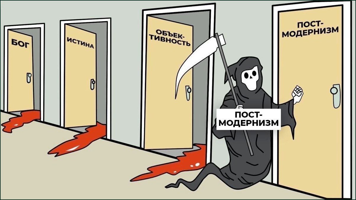 На изображении представлен ряд дверей, символизирующих различные концепции. Из-под первых трех дверей – «Бог», «Истина» и «Объективность» – вытекает красная жидкость, похожая на кровь, что подразумевает их «смерть» или исчезновение. Смерть, олицетворяющая «Постмодернизм» (Postmodernism), держит косу и стучится в четвертую дверь, на которой также написано «Постмодернизм». Это может означать, что постмодернизм является причиной «смерти» предыдущих концепций или что он ищет себя в своих же идеях.