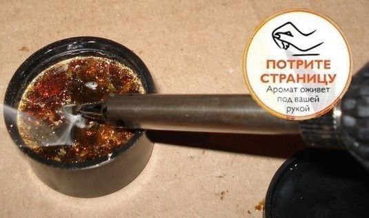 На изображении показан нагретый паяльник, погруженный в баночку с канифолью. От контакта горячего жала с канифолью идет характерный белый дым. Справа расположен круглый стикер, имитирующий рекламный элемент с предложением потереть страницу, чтобы "аромат ожил под вашей рукой". Этот мем играет на контрасте между обыденным, но очень узнаваемым запахом плавленой канифоли при пайке и рекламным обещанием чудесного аромата, который "оживет" при трении. Для всех, кто хоть раз держал в руках паяльник, этот "аромат" хорошо знаком.