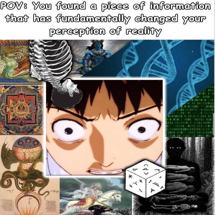 На изображении представлен коллаж, центральную часть которого занимает крупный план лица персонажа аниме с широко раскрытыми от ужаса глазами и искаженным в гримасе ртом. Вокруг него расположены различные изображения, которые могут символизировать глубокие философские, научные или мистические концепции. Среди них видны мандала, фрагменты ДНК, бинарный код, анатомические иллюстрации, религиозные и мифологические сюжеты, а также изображения, напоминающие о древних знаниях и мистике, вроде человека с мертвыми телами или игральной кости с непонятными символами. Над всем этим расположена надпись: "POV: You found a piece of information that has fundamentally changed your perception of reality", что переводится как: "POV: Вы нашли информацию, которая фундаментально изменила ваше восприятие реальности". Этот мем иллюстрирует момент осознания чего-то шокирующего или прозрения, которое полностью меняет представление человека о мире, вызывая замешательство, страх или потрясение.