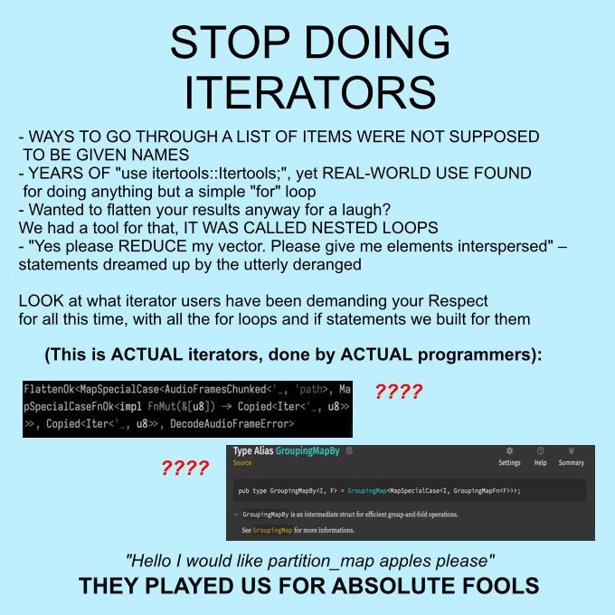 Stop doing iterators. - Ways to go through a list of items were not supposed to be given names. - Years of "use itertools::Itertools;", yet real-world use found for doing anything but a simple "for" loop. - Wanted to flatten your results anyway for a laugh? We had a tool for that, it was called nested loops. - "Yes please reduce my vector. Please give me elements interspersed" - statements dreamed up by the utterly deranged. Look at what iterator users have been demanding your respect for all this time, with all the for loops and if statements we built for them. (This is actual iterators, done by actual programmers). Flattenok<Mapspecialcase<Audioframeschunked<', 'path>, ma pspecialcasefnok<impl fnmut(&[u8]) → copied<Iter<', u8>>>>>, copied<Iter<, u8, decodeaudioframeerror>. Pub type groupingmapby<I, F> = groupingmap<Mapspecialcase I, groupingmapfn<F>>>; Groupingmapby is an intermediate struct for efficient group-and-fold operations. See groupingmap for more informations. "Hello I would like partition_map apples please". They played us for absolute fools.