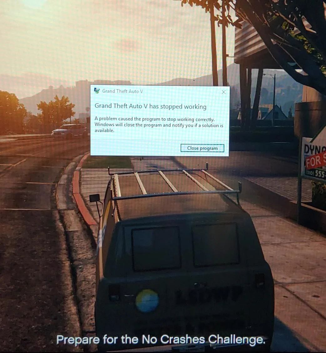 Grand Theft Auto V has stopped working. A problem caused the program to stop working correctly. Windows will close the program and notify you if a solution is available. Prepare for the No Crashes Challenge.