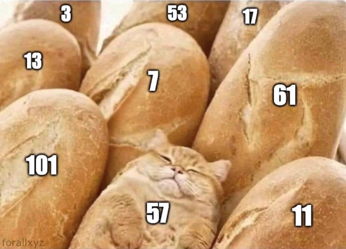 На изображении показан пухлый рыжий кот, уютно устроившийся среди множества свежеиспеченных булочек. Каждая булочка, кроме той, на которой сидит кот, помечена простым числом: 3, 13, 101, 7, 53, 17, 61, 11. Число 57, которое находится на коте, является составным (делится на 3 и 19), что делает кота "самозванцем" или "impostor" среди простых чисел. Кот выглядит очень довольным и расслабленным, его глаза прищурены, а мордочка выражает полное умиротворение. Эта картинка сочетает в себе милый образ кота и юмор, основанный на математической концепции, что делает ее популярной среди любителей головоломок и мемов.