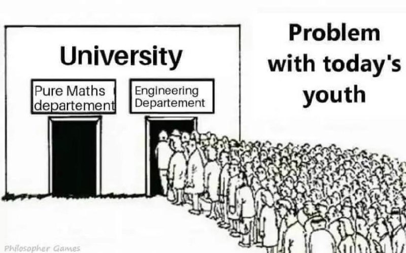 На изображении показано здание университета с двумя факультетами: чистой математики и инженерии. К инженерному факультету стоит огромная очередь из людей, в то время как к факультету чистой математики не стоит никто. Над толпой написано: «Problem with today's youth» (Проблема современной молодежи). Это изображение высмеивает тот факт, что многие молодые люди выбирают более популярные и, возможно, более оплачиваемые профессии, игнорируя фундаментальные науки, такие как чистая математика. Мем подчеркивает дисбаланс в выборе специальностей среди студентов, предполагая, что это является проблемой в современном обществе.