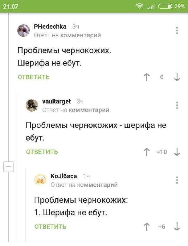 На изображении показан скриншот экрана смартфона с комментариями к посту. В каждом из них повторяется фраза «Проблемы чернокожих. Шерифа не ебут.», написанная разными пользователями, каждый со своим вариантом пунктуации. Это, вероятно, обсуждение, где пользователи пытаются правильно сформулировать или понять смысл некой пословицы или афоризма, связанного с проблемой, что «шерифа не ебут», то есть не досаждают и не наказывают. Каждый комментарий имеет кнопки для голосования «за» и «против», а также кнопку «ответить». Время на скриншоте 21:07, а заряд батареи составляет 29%.