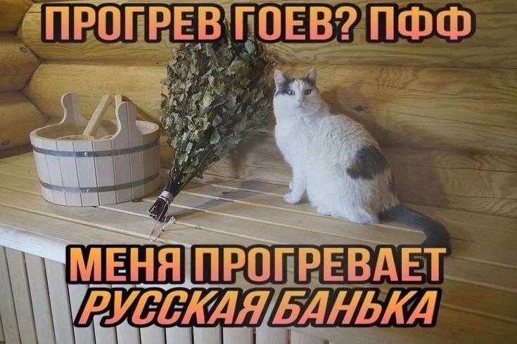 На изображении представлен мем с кошкой в русской бане. Бело-серая кошка сидит на деревянной полке, рядом с ней стоит деревянное ведро с ковшом и лежит банный веник из веток. На фоне видны стены из бревен. Сверху надпись "ПРОГРЕВ ГОЕВ? ПФФ", а снизу "МЕНЯ ПРОГРЕВАЕТ РУССКАЯ БАНЬКА". Таким образом, мем высмеивает понятие "прогрев гоев" и противопоставляет ему традиционную русскую баню, как источник истинного "прогрева".