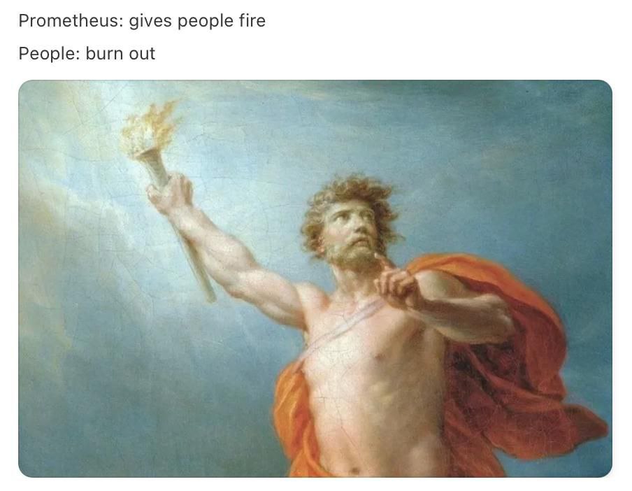 Мем основан на известной картине французского художника Николаса Гийома Брене «Прометей» 1762 года, на которой изображен Прометей, передающий людям огонь. В меме к этому изображению добавляется подпись «Prometheus: gives people fire. People: burn out», что в переводе означает «Прометей: даёт людям огонь. Люди: выгорают». Это отсылает к современной проблеме эмоционального выгорания, которая становится все более актуальной в современном обществе.