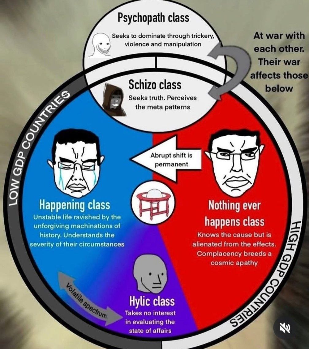 Psychopath class. Seeks to dominate through trickery, violence and manipulation. Schizo class. Seeks truth. Perceives the meta patterns. At war with each other. Their war affects those below. Low GDP countries. Happening class. Unstable life ravished by the unforgiving machinations of history. Understands the severity of their circumstances. Abrupt shift is permanent. Nothing ever happens class. Knows the cause but is alienated from the effects. Complacency breeds a cosmic apathy. Hylic class. Takes no interest in evaluating the state of affairs. Volatile spectrum. High GDP countries.